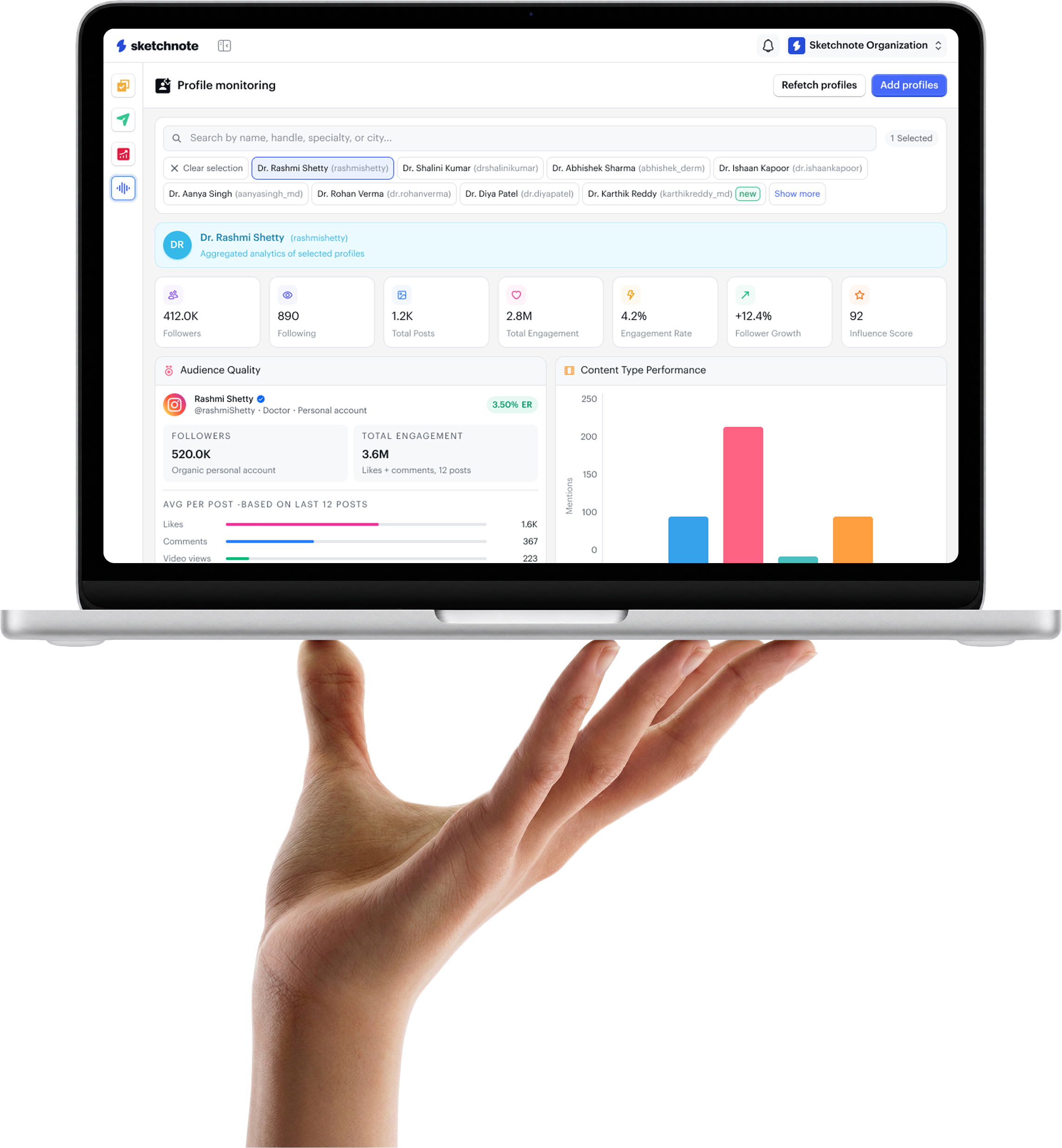Search and add any Instagram handle, import profile lists, or let our AI discover relevant profiles in your niche automatically.